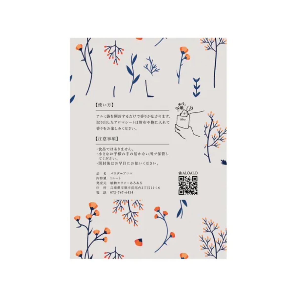 アロマ業界初粉末アロマ「POWDER AROMA」をシート状に加工、アルミ袋で密封した商品で精油を最後の1滴まで有効に使用した商品です。